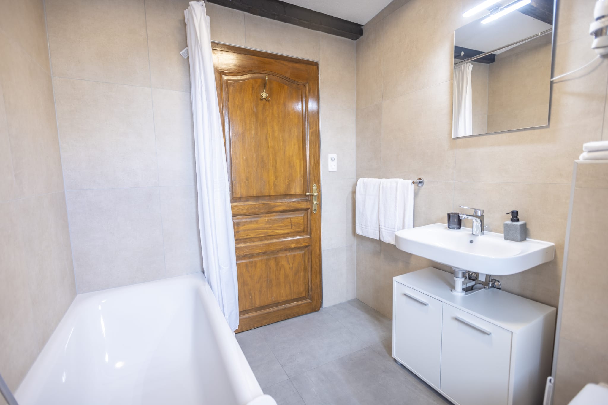 Cuisine équipée - Réfrigérateur - Salle de bain privée avec baignoire - TV écran plat - Coin repas - Salon